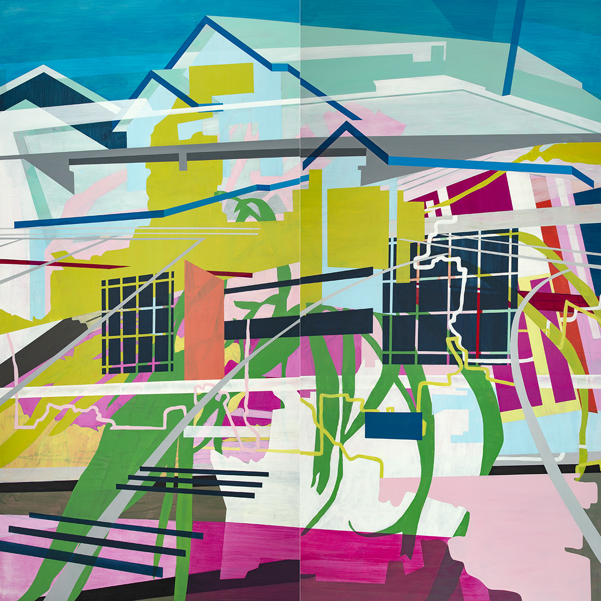 As you look at this painting, you might notice things that look like rooflines, or windows or plants. All those things and many more are in this painting! I believe that who we are as individuals is an accumulation of all these experiences that we’ve had in lots of different places- in houses, schools, churches, backyards, friends’ houses, and so on. To me those experiences are tied to a place; when I think of those memories it’s always based somewhere. I’m including all these fragments from different places in my life, kind of layered on top of each other, to represent or stand in for everything I experienced there. So really I’m trying to visualize this whole messy, complicated history and identity of who I am.