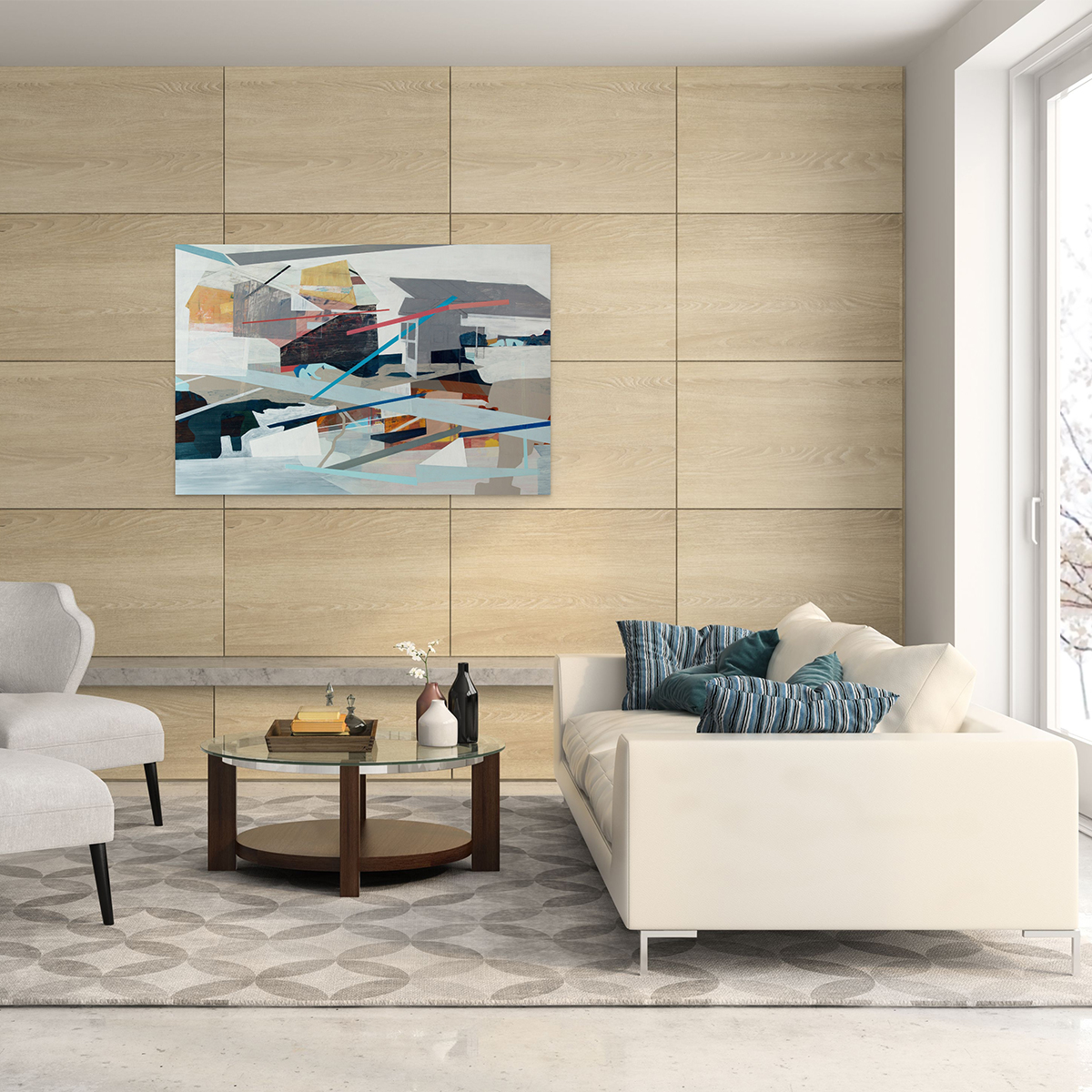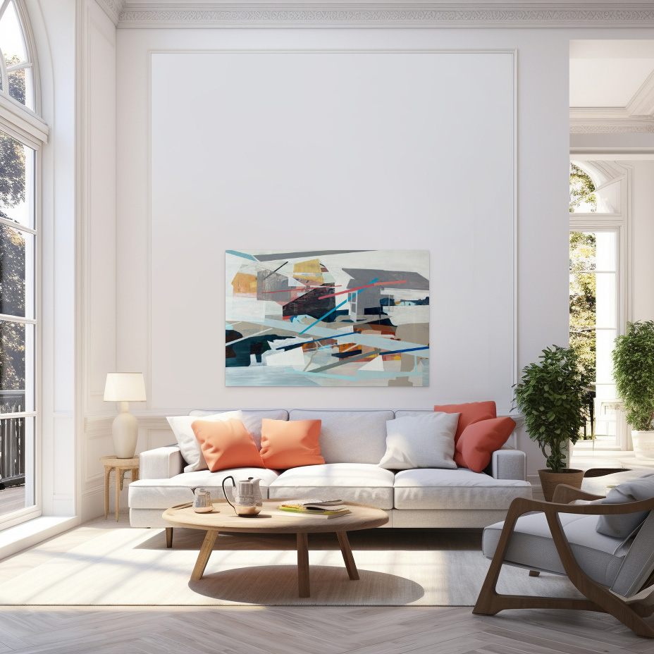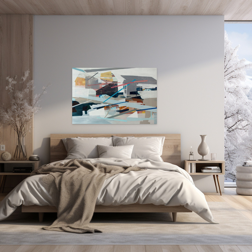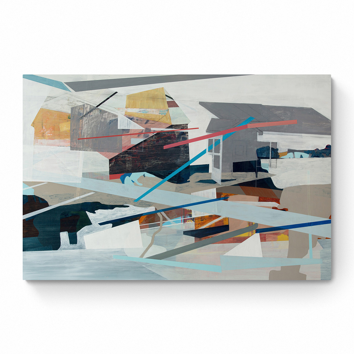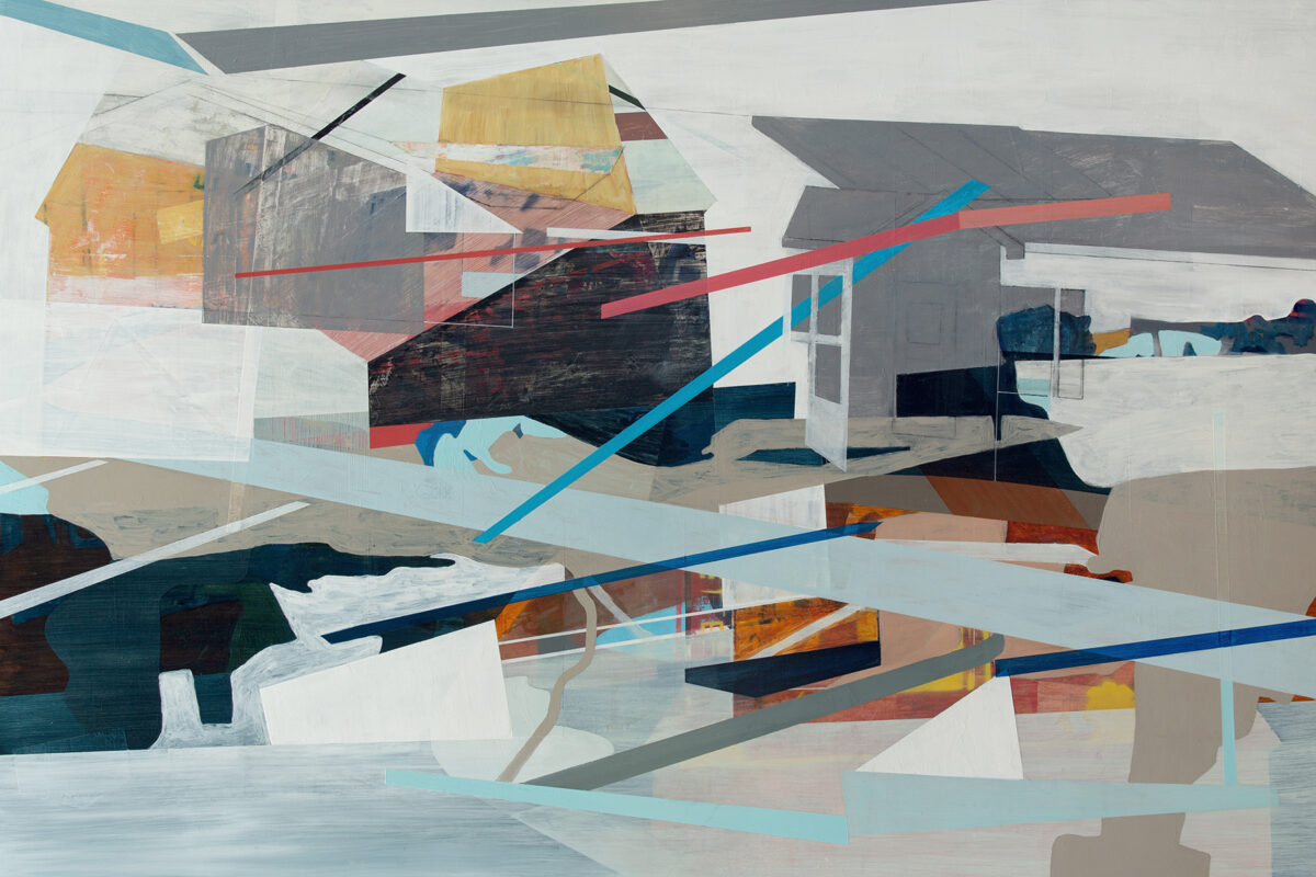 Most of my paintings (including this one) are based on the idea that who we are as individuals is a collection of all these different experiences that we’ve had in different places.   I combine fragments from those places to suggest this layered process of “becoming”.  The imagery in this painting comes from several abstracted views (interior and exterior) of places I’ve lived, worked, or gone to school.  The title “The Lay of the Land” suggests this is the current state of things, but the layering present within the piece implies that even as we’re living our lives now, there’s this whole, underlying past- running below it all- that continues to influence us.